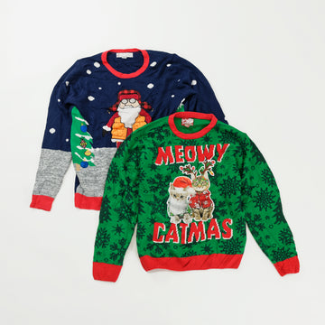 'Tis the season to be cozy and jolly with our fabulous collection of "Christmas Sweaters" – where holiday cheer meets thrift store treasure! Embrace the festive spirit with these delightful preloved sweaters, adorned with adorable reindeers, jolly Santas, and shimmering snowflakes. Each sweater carries the magic of past holiday seasons, waiting to be your new favorite winter companion. Whether you're sipping hot cocoa by the fireplace or rockin' around the Christmas tree, our selection promises to keep you snug and stylish all winter long. So, don't be a Grinch; join the merry thrifting ride and sleigh the holiday fashion game in our festive Christmas sweaters! Happy thrifting and ho, ho, ho! 🎅🎄🎁🛍️
